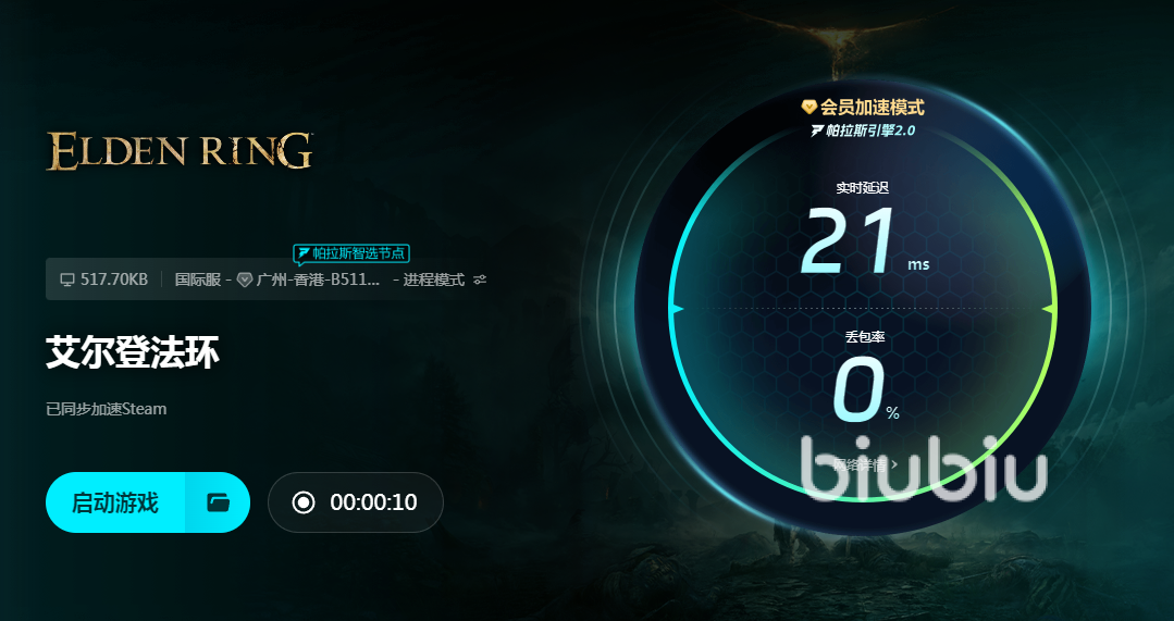 并不是所有加速器都是正规专业的,大家挑选的时候一定要擦亮眼睛,如果你还没用过biubiu,现在赶紧点击上面的按钮下载它吧,它可是很多大神都爱用的专业游戏加速器,价格实惠性能优越,现在注册新用户还可以免费加速24小时,有了试用资格以后大家只要在软件里找到艾尔登法环,就能点击蓝色按钮来加速了。