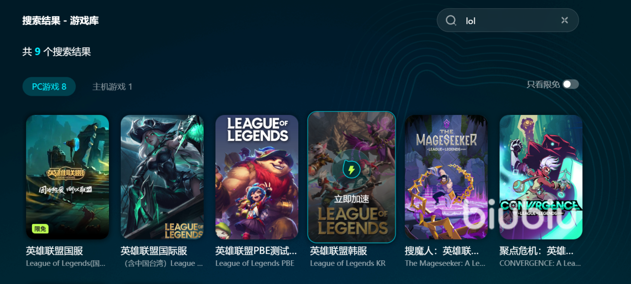 这款加速器它拥有一个非常大的游戏库,当今比较受欢迎的游戏都可以以在这上面找到,当然lol也包含在内。大家可以在主页的操作栏中搜索大家需要加速的游戏,然后在我的游戏栏目中选择进行加速,还可以选择不同的区服和节点。更重要的一点是他还支持PC游戏和主机游戏加速。