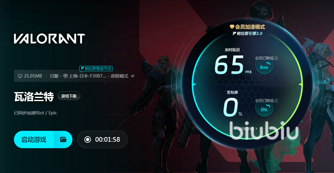 如果你还没尝试过biubiu,现在就赶紧下载,只要点击上面的按钮就会看到下载链接。它支持智能节点,会自动检测用户所在的网络环境,通过多条线路的方式进行加速。大家在biubiu里可以搜索到有瓦洛兰特国际服和无畏契约国服两个版本,如果玩的世国服的话是可以限免加速的哦。