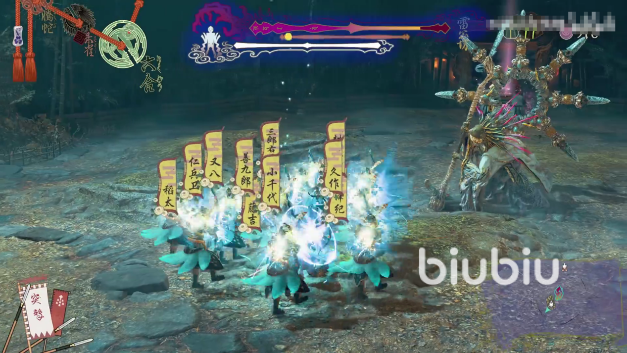 雷公坊擅长使用雷电攻击,玩家需保持灵活,利用闪避和格挡躲避其致命一击。同时指挥村民围圈造成持续伤害,BOSS每当掉落20%的血量,雷公坊都会释放一个技能。当雷公坊血量跌落50%的时候会释放大招,将雷电锥子插满全场,此时锥子可以安排村民去击破。当BOSS陷入僵直或暴露弱点时,立即指挥所有村民和守卫宗集中火力进行攻击,利用连段和奥义技能造成高额伤害。