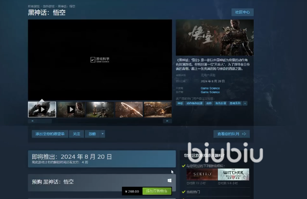 安装好后在商店的搜索栏输入黑神话悟空,接着在下拉菜单中将出现这款游戏。此时我们点击进入游戏页面后,选择旁边添加购物车的按钮,在新弹出的窗口中点击查看我的购物车。再点击蓝色的继续付款按钮,选择喜欢的付款方式并继续。最后付款完成后便可以到游戏库中找到该游戏,等到8月20号当天便可以点击进行下载安装了。