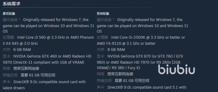 此游戏在配置要求上相对较为合理,既保证了游戏的流畅运行,又兼顾了大多数玩家的硬件配置,在最低的配置方面我们只需要CPU达到了i3 560、运行的内存为6G、显卡为GTX460、全程需要互联网、DirectX在9代以上以及61G可用的硬盘空间,这样就能以最低特效运行了。