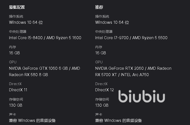 本作需要预留130GB的硬盘空间,并需要玩家至少Windows10以上系统,另外内存方面给到了16GB,需要DX11的支持,否则着色器渲染将可能会出现画面异常的情况,这意味着太老的电脑兼容性不是很好。