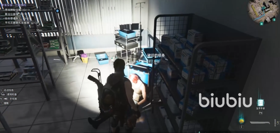 在进房间后,可以和破旧的纸条互动,互动之后,左前方的架子上有急救药品,上去互动,互动之后会被传送到另一个空间。然后再回头往小地图12点方向走,到头以后左转到小地图9点方向。到关门处回头,在小地图3点方向,可以看到一个轮椅和空间门,我们跟着轮椅直接走进去。