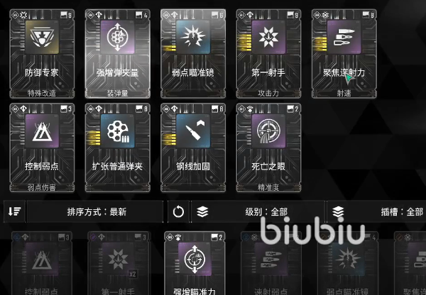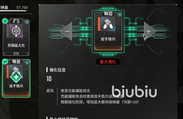 我们在查看武器的时候右边会有一个隐藏的按钮,点开后会发现有许多个卡槽,这些卡槽里面存放着的便是武器的模块。需要注意的是每个插槽在最开始的时候都有容纳上限,在界面的右上角我们可以点击最大容纳量增加,之后使用能量活性体来增加容量。上面的赋予模块插槽类型可以给予模块上结晶化催化剂。