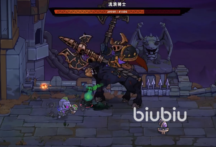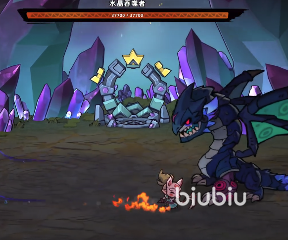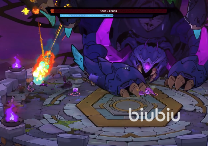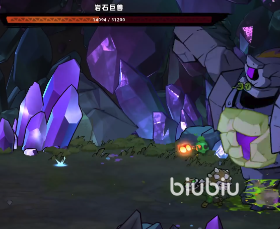 岩石巨兽:固定在画面右边的boss,可以召唤冲天而落的巨石,同时还会用双手挥击玩家。这个boss打他的话,需要先打破他肚子上的石块,不然掉血速度会非常的慢。石块打掉后还会恢复,因此这里就需要大家不断的走位去打一个持久战。