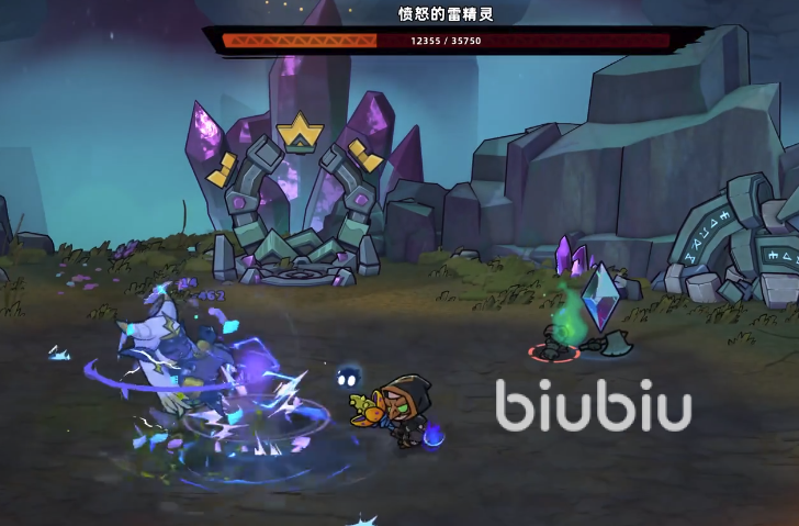 愤怒的雷精灵:擅长雷电攻击的boss,可以不断的召唤闪电来攻击玩家,同时还会瞬移来到战场的其他区域。玩家要打她的话,首先要破除她的护盾,这里需要拾取战场上的锥形晶体砸向boss,砸到两次后可以破除她的护盾,打起来就很快了。