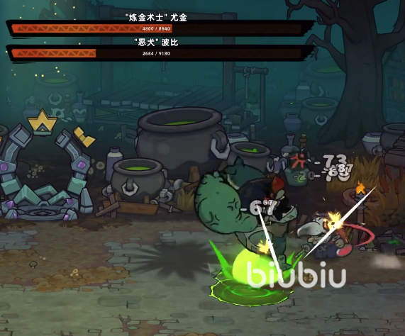 炼金术士尤金&恶犬波比:出现在同一关卡的两个boss,尤金是一位远程法师,攻击手段是丢各种药瓶,药瓶落地后会有一个小的范围伤害。血量越低,扔药瓶的速度越快,这个大家要注意下的。恶犬波比以近战攻击为主,他会不断使用双手锤击地面,每隔一段时间还会发起冲锋,在血量掉到三分之一后,会进入狂暴状态,技能范围变大,同时伤害变高,大家可以在其释放技能间隙进行攻击。