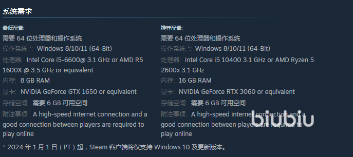 游戏官方目前给出了两种配置的要求,第一种为最低配置,我们只需要电脑达到8代以上的64位操作系统、6代的i5、8G的运行内存、1650或者性能差不多的显卡、全程需要稳定且高速的互联网连接,以及足够的硬盘空间就能体验这个游戏了。