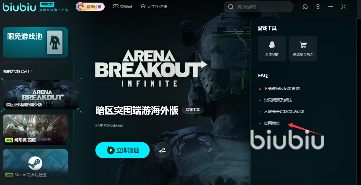 对于PC玩家而言,原本使用steam下载此游戏是最为简单的方法,但由于目前该游戏对中国大陆地区进行了锁区的处理,国内是无法直接访问其商店页面的。所以我们需要借助biubiu加速器的帮忙在官网进行下载,在客户端里面搜到游戏以后,就可以在右边框的游戏工具内找到游戏官网连接,点击进入以后就可以了下载了。