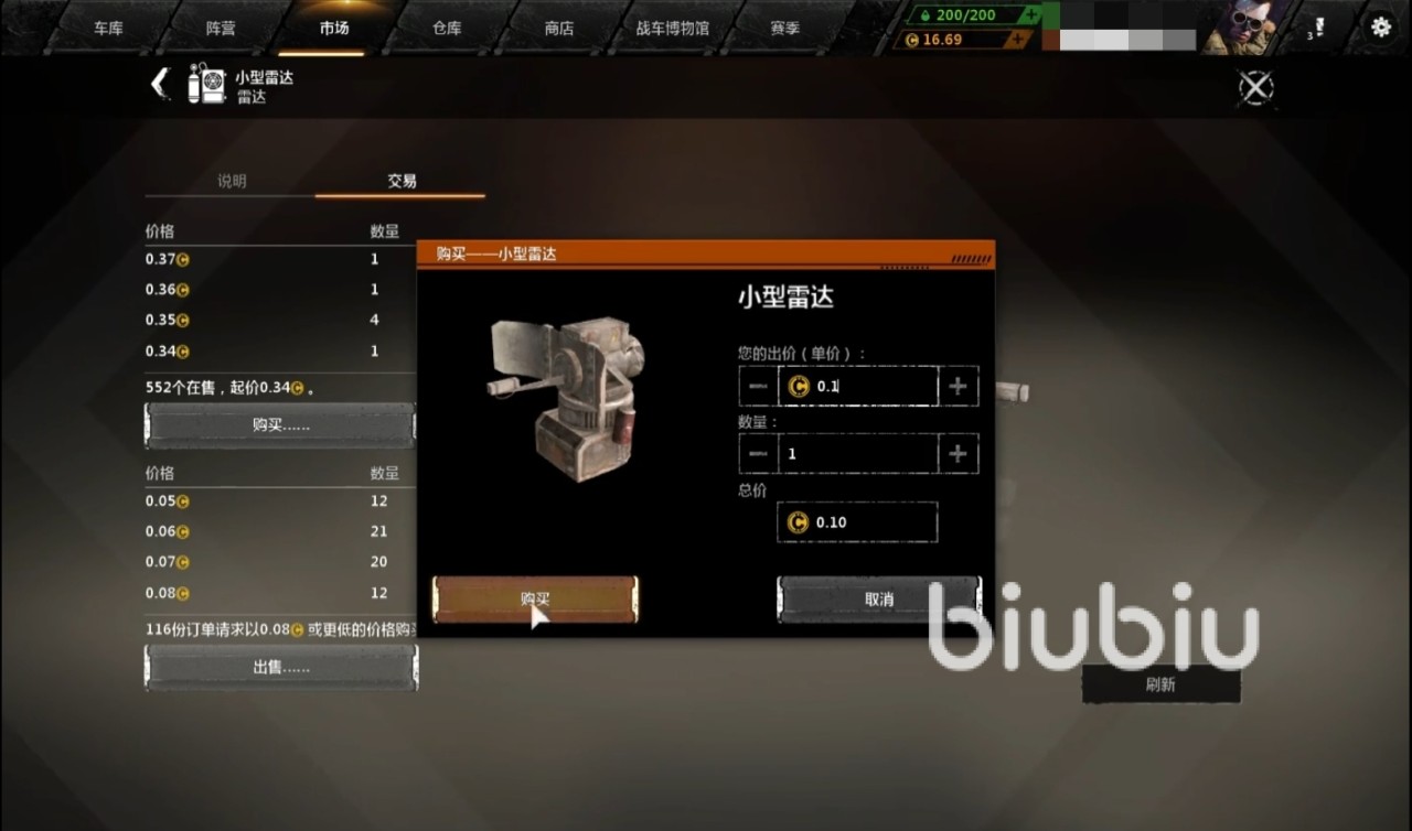 玩家们在达到一定的等级以后便可以开启市场,大家可以购置自己需要的资源,或是变现。游戏里面我们的战车因为改装的自由性很高,所以也产生了不少的流派。这些流派所需要的配件都是不一样的,我们在在竞技之中会获取到各种类型的奖励,这些奖励之中有些事我们所需要的,而一些我们不需要的则是可以放到市场上进行出售。