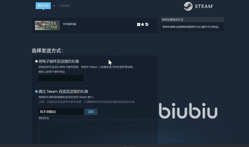 通过这个数字游戏平台,玩家可以相互赠送游戏来提升上方的友谊,在自己的steam账号上筛选想要赠送的游戏,在加入购物车附近会看到赠送相关字样,在点击之后弹出的窗口当中选择接受者,确认无误之后根据流程操作购买即可,这样好友上线了之后就会收到一份通知,然后按照提升下载安装即可。