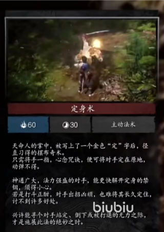 定身术:短时间内定住敌人,打断其攻击并造成硬直。定身时长因敌人类型而异,对强力BOSS效果较短。在关键时刻使用定身术,可以打断敌人关键技能,为悟空或队友创造反击机会,然而面对高级BOSS时需谨慎使用,以免定身时间不足导致躲闪不及被BOSS伤害。