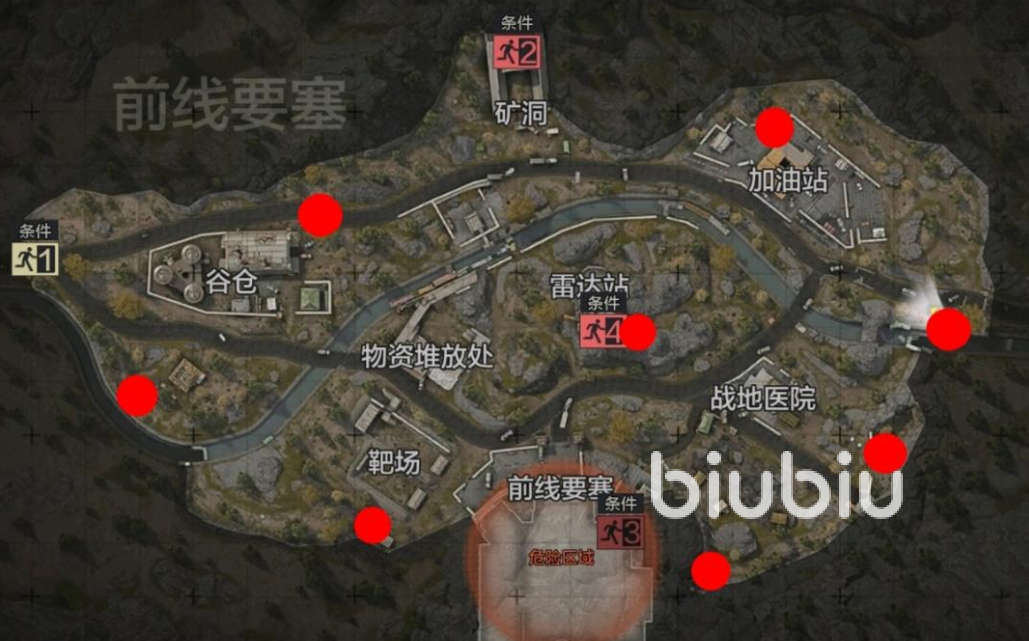 本作的全图先为大家以插图的方式放在这,可以其中标红点的,是敌人也就是游荡者的出生点。如果你对自己的实力非常有自信,那么可以一上来就去,毕竟高风险也伴随着高收益,那里物资也很多,但是一般玩家还是按部就班的来比较好。