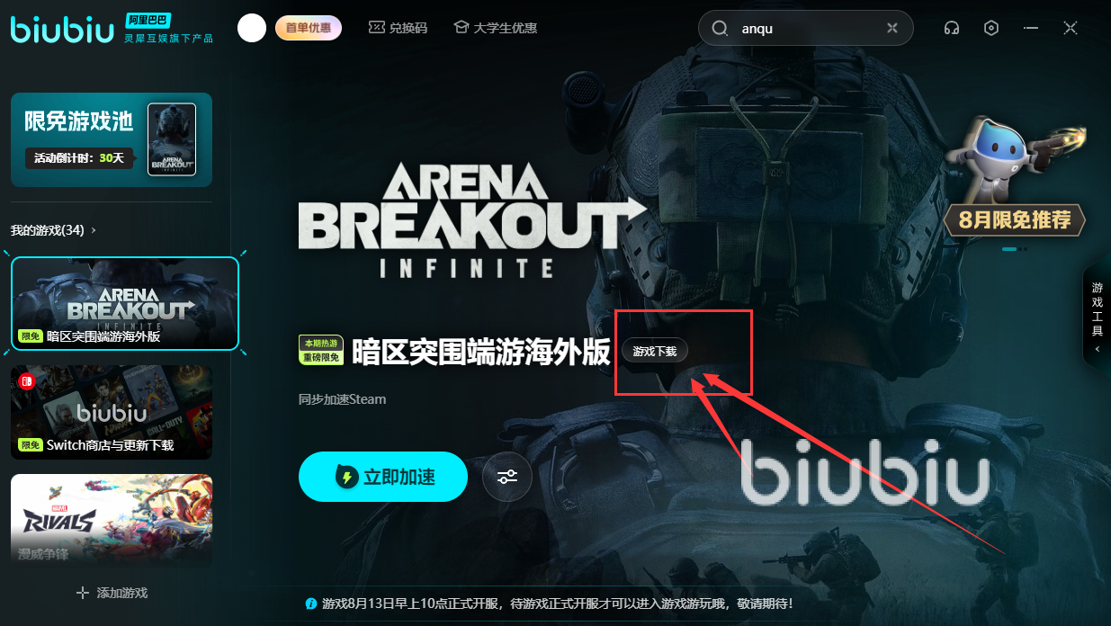 有些小伙伴可能担心费用问题,现在不用担心了,现在特别推出了限免活动,暗区突围pc版首月biubiu免费加速!直接在biubiu首页搜索游戏就可以一键下载并加速了。