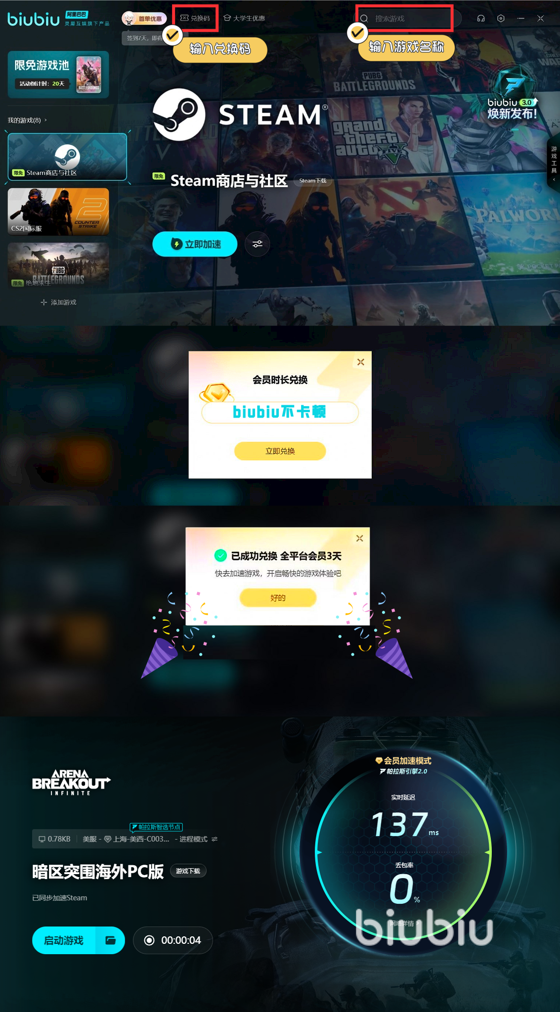 除此之外,无论是新老用户使用“biubiu不卡顿”都可以兑换3天全平台会员,具体流程直接参考下方流程图。不仅如此,每个biubiu的新用户都会自动获得24小时的免费加速时长,对新人来说就是合计96小时免费加速时长体验。