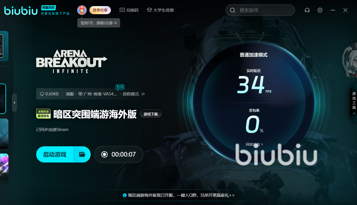 另外为了能让更多新用户体验到加速的乐趣,这里也给新用户提供免费24小时的加速服务。这里所有用户还可以用【biubiu不掉线】口令来获取72小时的会员,新用户叠加福利后等于一次体验96小时。同时针对暗区突围PC版,biubiu还提供首月免费加速,福利拉满。