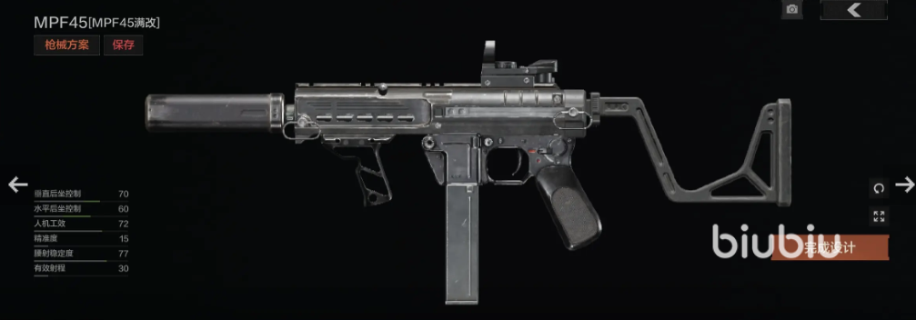 MPF45:入门级别的冲锋枪,很适合新手使用,不过属性并不是很高,中后期有能力最好是进行更换。