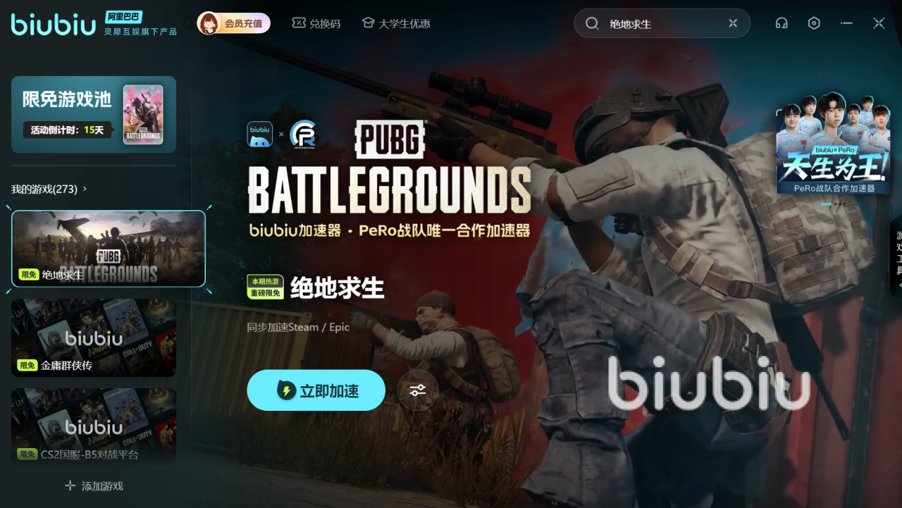 绝地求生是高竞技类型射击游戏,对于网络的要求十分严格,在紧急关头决定生死的瞬间如果遇到了掉帧或者是卡顿的情况,界面瞬间扭转从猎手秒变猎物,所以作为高帧率高反馈的加速工具biubiu是最值得大家选择的,也是整个PeRo战队不可获取的伙伴。