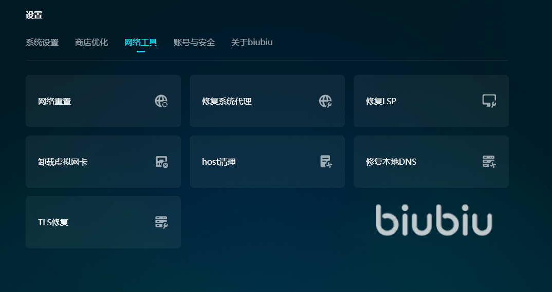 biubiu的功能非常强大,有时候网络是没有问题的,但是网关设置会出现故障,大家不知道如何调整,那就使用网络工具里面的各种修复功能进行调整吧,这样就可以顺利解决该问题了。