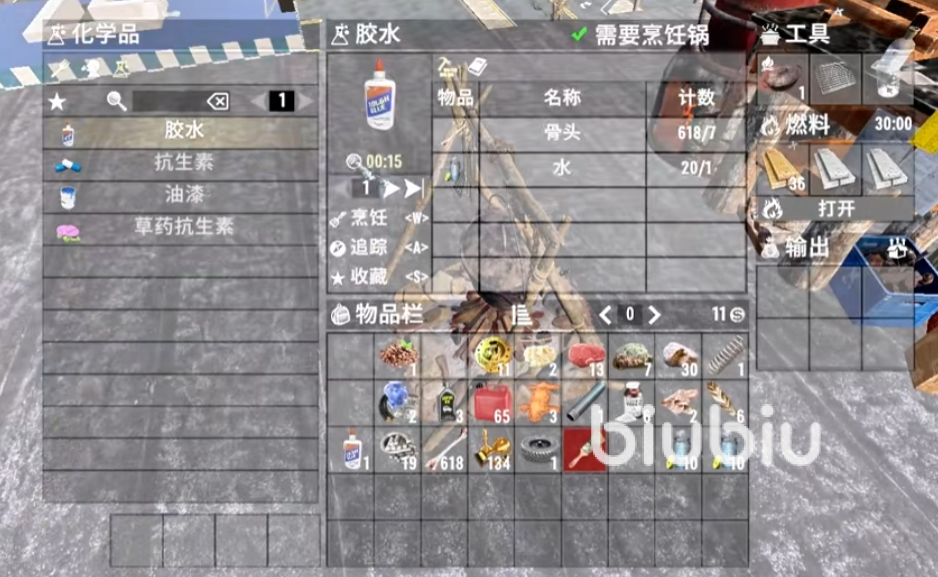 前期我们主要可以通过搜刮和打猎的方式来获取胶水和碎布。如果没有化学工作台的话,那么可以在篝火处使用烹饪锅来制作胶水,一瓶水和7个骨头就能制作—瓶胶水。碎布的话,在前期没有技能加成的情况下,最有效率的方式就是通过分解衣物或者是拆除床和窗帘等布置品来获取。