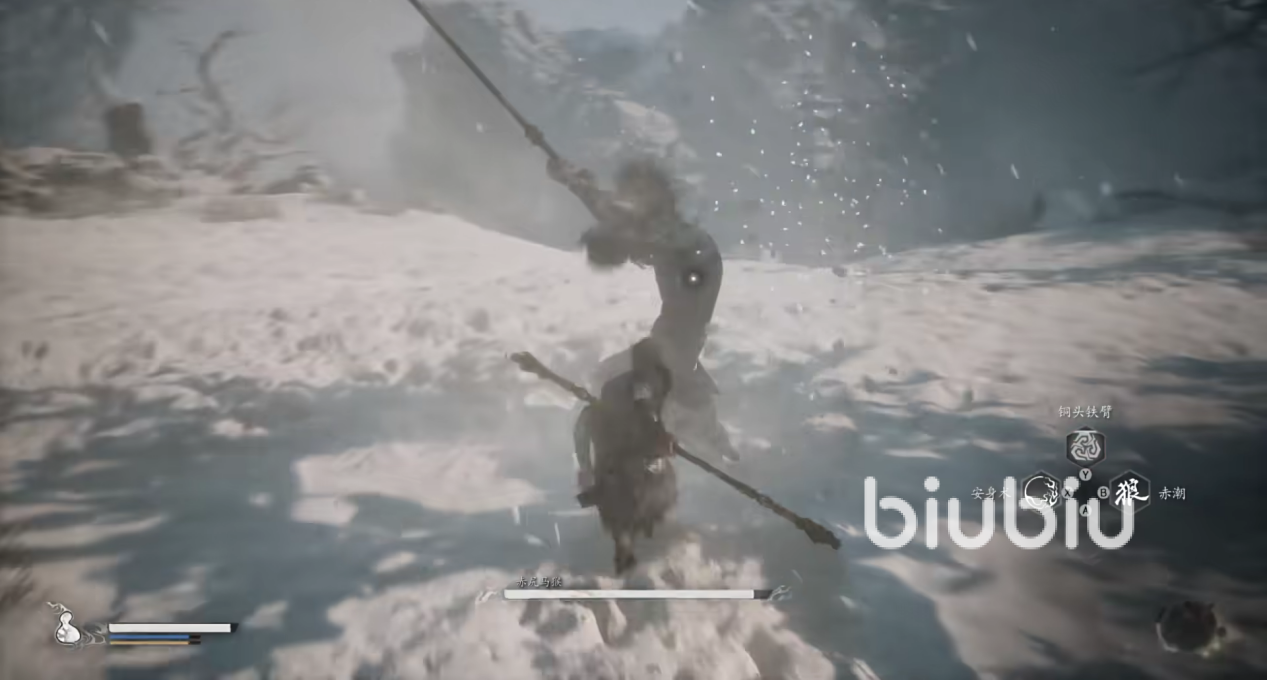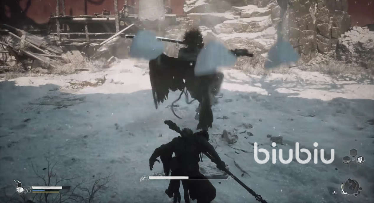 当赤尻马猴进入第二阶段时,他会长出黑色翅膀,移动速度加快,并召唤冰柱进行攻击。此时需更加注意躲避其远程攻击,同时利用其释放大招后的僵直状态进行反击。当赤尻马猴飞上天空准备释放分身时,我们需迅速找到安全位置躲避其冲击。