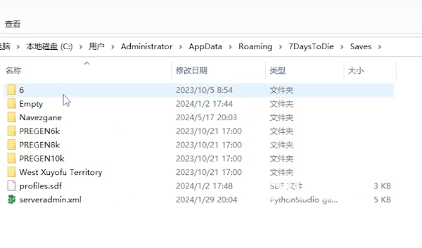 接着打开我的电脑,在菜单栏中选择查看,将隐藏的项目勾选上,这样做的原因是我们的存档文件是隐藏。然后找到游戏的存档位置,一般在用户的APPdata的ROAMING里面,找到对应的游戏名,再选择SAVES这个文件夹。最后将navezgane这个文件夹进行压缩,即可完成存档操作。