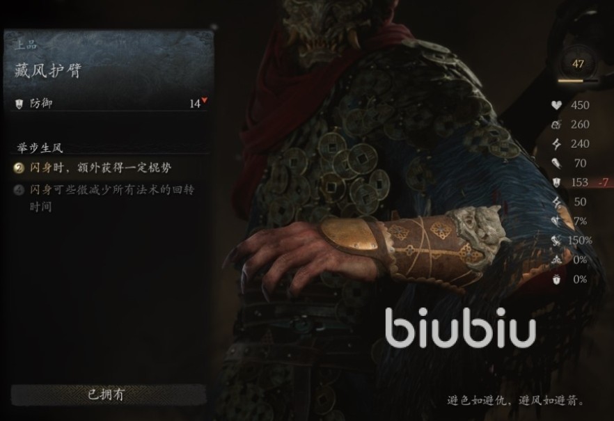好了,以上内容便是黑神话悟空藏风护臂的全部介绍了,在游戏的探索过程中,一个上品防具,不仅能为大家提供稳定的基础防御力加成,同时还拥有独特的效果提升,让玩家的战斗效率得到进一步的增加,如果想要去体验该游戏的话,记得去下载biubiu来帮助自己哦。