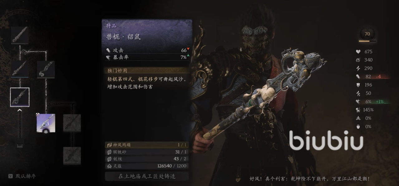 整体打法就是第一阶段不用法术,给第二、三阶段留法力,变形等到第三阶段再使用,等到击败黄风大圣玩家就可以获得材料神风玛瑙,同时也会解锁兽棍貂鼠武器的锻造,有了神风玛瑙后妖核、灵韵和镔铁砂都是十分好收集的,最后将这几种材料集齐就可以锻造这把武器了。