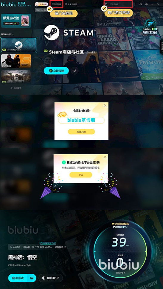小伙伴们在下载黑神话悟空的时候,可以点击上方按钮先下载一个biubiu加速器稳定下载环境,而且现在有个好消息,那就是新用户注册有24小时免费时长的赠送,此外使用兑换码【biubiu不卡顿】还能再得额外3天的免费时长。
