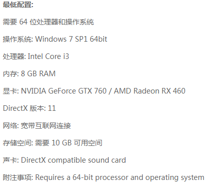 游戏要求最低为win7搭配上i3的处理器就可以正常游玩了,而内存方面则需要至少8GB运行以及10G的可用空间,整体看这个要求对于目前市面上的电脑来说,都是可以达到的。