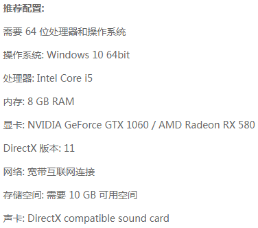 推荐配置需要要求i5及以上,但同样对于内存方面也只有8G的限制,再加上1060就可以完美运行,可以说是官方对于适配方面做的还是十分优秀的,能够保证大多数玩家都能入坑体验。