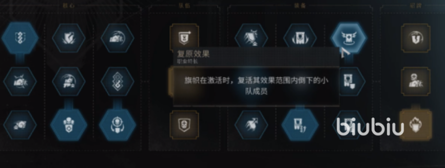 最后,我们点出装备中的迅速恢复,鼓舞士气和复原效果。其中迅速恢复可以帮助我们快速恢复护甲。鼓舞士气可以全体小队恢复最大缓冲生命值。而复原效果可以复活旗帜范围内阵亡的队友。
