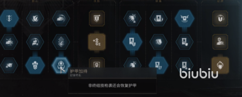 首先,我们选择将核心的信念不倒点出,可以在我们护甲完全消耗完时,降低受到的生命伤害。然后点出杂乱瞄准,在被多名敌人包围时,我们受到的远程伤害会降低20%。再点出护甲加持,在我们成功格挡或者弹反敌人攻击时,它能提供护甲恢复。