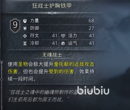 这是后期非常推荐使用的一个盔甲套装,光是一个胸甲,就可以为我们带来很多的力量数值提升,另外防御也是很高的。同时它搭配的无魂战士这个词条,给我们带来的伤害加成是不俗的,当我们使用圣物的时候,奎托斯的近战攻击伤害会得到大幅度的提升,但是自身也会受到相应的伤害。