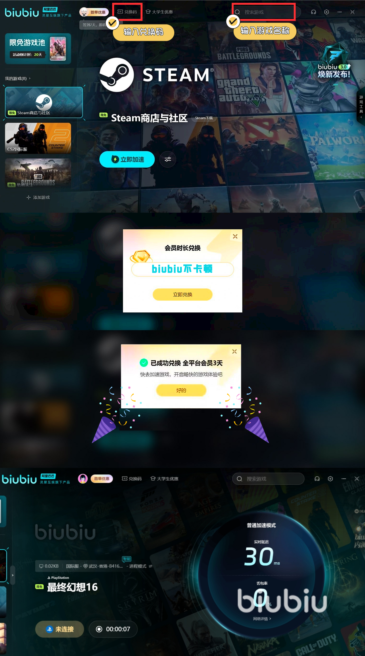 大家用它还有一个好处,那就是可以得到免费使用时间,不管是新老用户,知道兑换码是【biubiu不卡顿】之后,都能换取免费的72小时加速时间,而且新人本身在登录的时候,就可以领到免费的24小时加速时间,加一起新用户可以用96小时的。