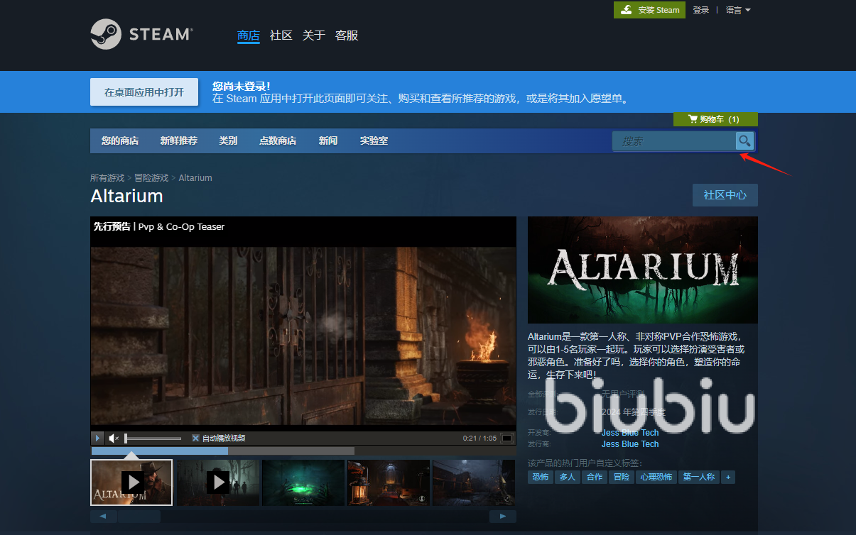这个游戏是上线Steam平台的,在这里,它的名字就是Altarium,不过注意下,在Steam上是没有中文名选项的,所以我们进行查找的时候,只能输入英文名。