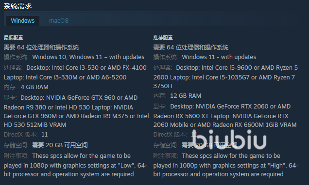 为了确保玩家能够流畅地体验,首先大家的电脑需要满足于64位的win10或者win11的系统,而处理器就得达到i3-530或者FX-4100了,显卡则要达到GTX960或性能差不多的A卡,运行内存达到4G以及拥有足够的储存空间以后我们就能以最低的特效来运行此游戏了。