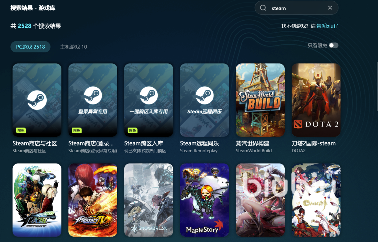 其实不管是登录慢,卡顿还是无法连接到服务器,都是玩家当前的网络问题所影响的,毕竟steam平台对于国内的玩家来说有一定的限制,本身就是海外推出的产品,网络不稳定肯定会影响到登录和更新的情况,启动了小编推荐的biubiu加速器之后,就可以轻松登录,专业的加速服务提供针对性的优化,直接在首页搜索steam即可看到加速版本,一键启动就可是尽情享用了。