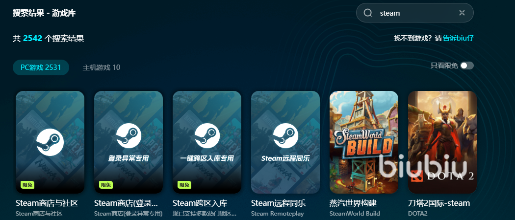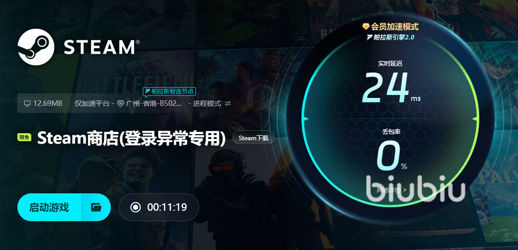 其实卡在登录界面这个情况是因为网络不够稳定所造成的。steam本身的服务器并不是在国内,所以在正常情况下玩家们登入游戏的时候会经常出现卡登录。想要解决它就需要使用加速设备才可以。现阶段biubiu是比较不错的加速器,它的帕拉斯2.0引擎可以解决绝大部分的加速问题。现在新用户可以获取到24小时的免费加速。如果使用兑换码【biubiu不卡顿】的话还能获得3天的额外加速时间。