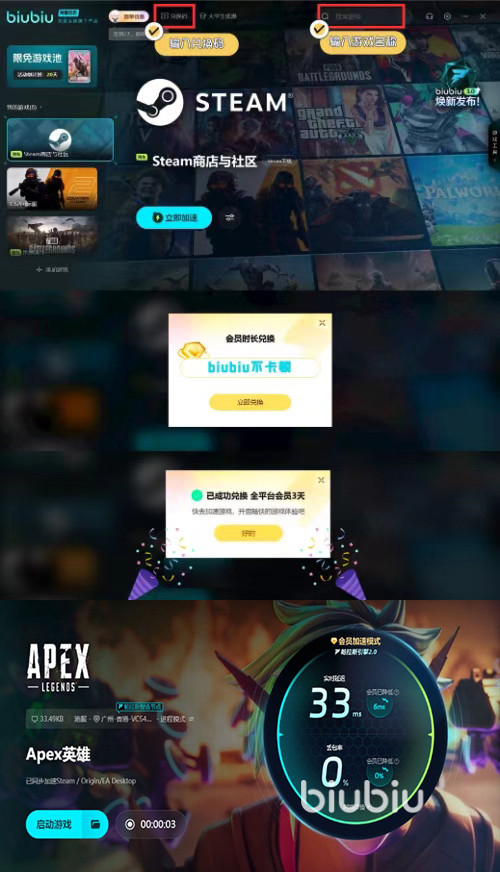 biubiu软件福利多多,它为新用户奉上了二十四小时免费体验时间,还有福利兑换码,使用biubiu不卡顿就能兑换。玩家在软件搜索框输入即可,增加三天免费使用的时间。