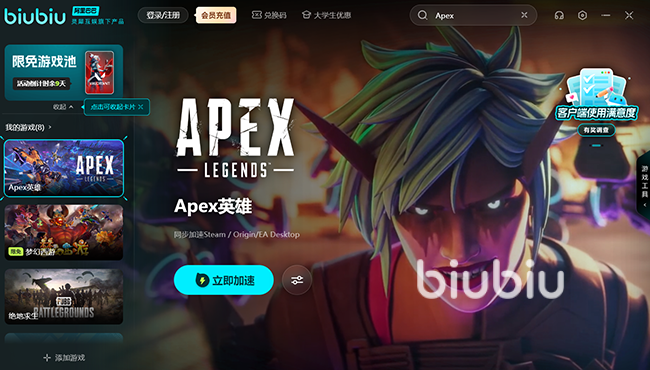 apex游戏挑战大,玩家们可能遭遇各种突发状况,需要随机应变的能力,获得身临其境的危机感,但是为了呈现绝佳的视听效果,玩家需要提前安装正规加速器,提升网速,优化网络环境。biubiu是高人气工具,它支持一键加速,对于新用户也非常友好,使用便捷。
