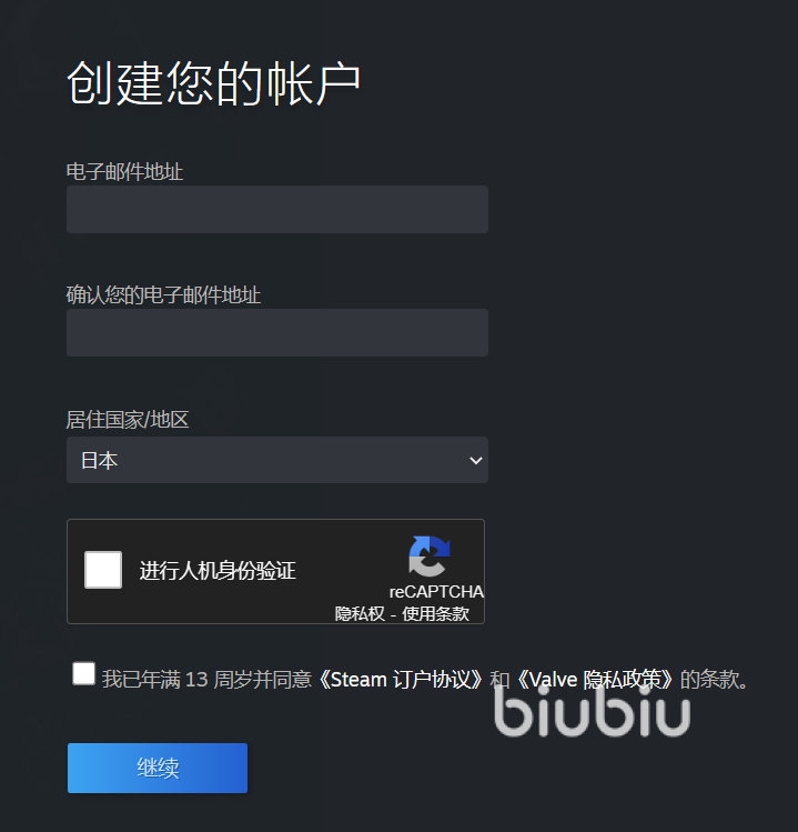 填写好你的邮箱地址,国家/地区则选择与你加速器所选区服对应的即可。这一步是需要进行人机验证的,但是别担心,因为开启了biubiu加速器,通常只需一次就能通过了。完成验证后,点击“继续”,并根据提示到你的邮箱中进行验证。如果你的邮箱已经注册过Steam账号,就选择下方的“继续”选项。之后,按照提示填写Steam的登录账号和密码,最后点击“完成”,你的外区Steam账号就注册成功啦!