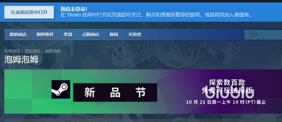 steam新品节试玩游戏这次还是比较丰富的,当我们了解一款游戏,比如我们想玩泡姆泡姆时就可以进入详情页,下载到试玩版本,如果对于玩什么新游没什么思路,还可以进入新品节专栏,在游戏库当中浏览寻找,在这个过程中,biubiu是都可以提供服务的。
