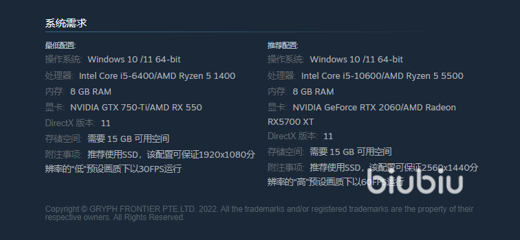 这款游戏现在还在研发当中,但是进度还是比较喜人的,制作出来了试玩版本上线Steam的新品节,也就代表游戏基本都完成了,剩下来的就是完善跟优化工作了。而当前版本下,我们就可以在Steam看到相关的配置需求,小编已经展示给大家了。可以看到对于处理器以及显卡的要求都不高,用i5系列以及GTX750ti的显卡都够了,存储内容也就在15GB左右,还是很好满足的。