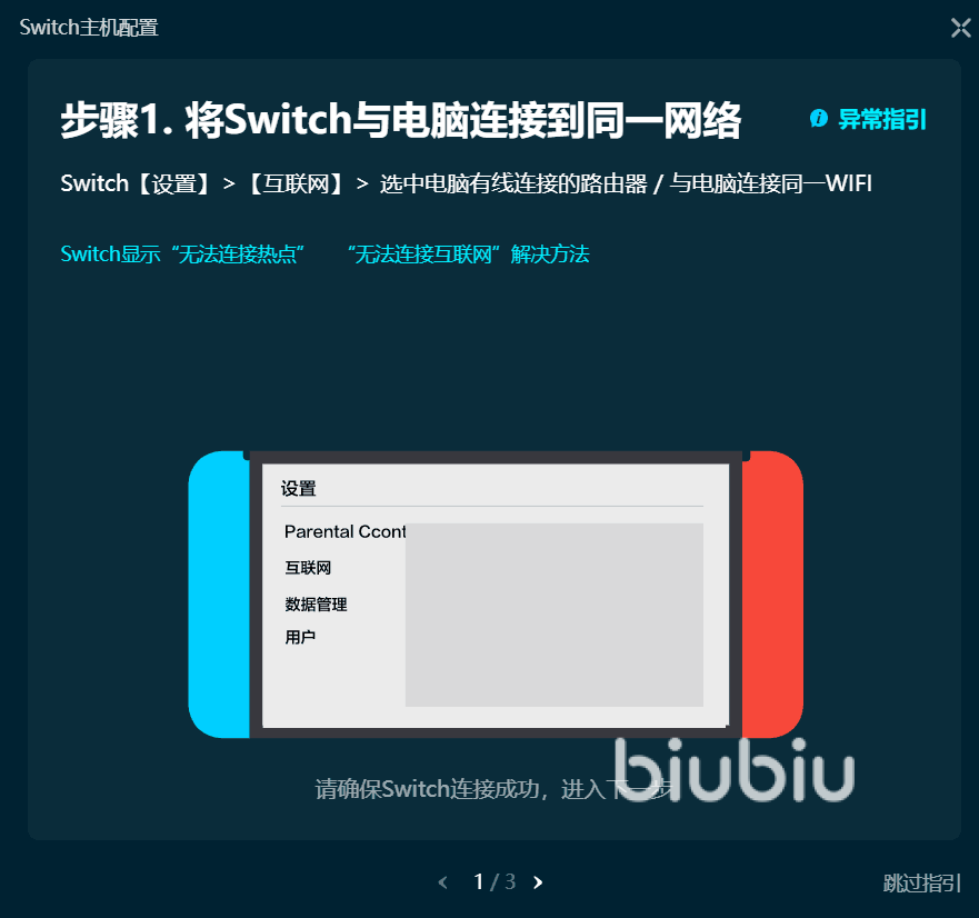 在使用switch的时候首次是需要进行设置的,不过别担心,设置步骤会在开启加速页的时候自动弹出,根据biubiu的提示一步步进行操作,就很简单了。