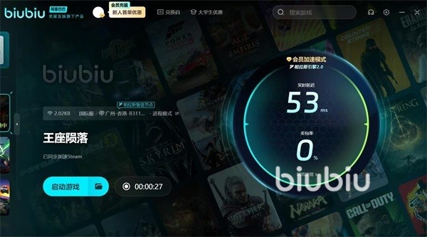 没有时长的小伙伴们在首页点击兑换码按钮,接着再输入【biubiu不掉线】口令即可换取72小时的加速时长,之后就能通过会员加速模式下的专用引擎来解决此类闪退问题。新用户还可以通过注册在biubiu中领取到24h的加速,并且加上兑换得来的时长总共可以得到96小时的会员体验哦。