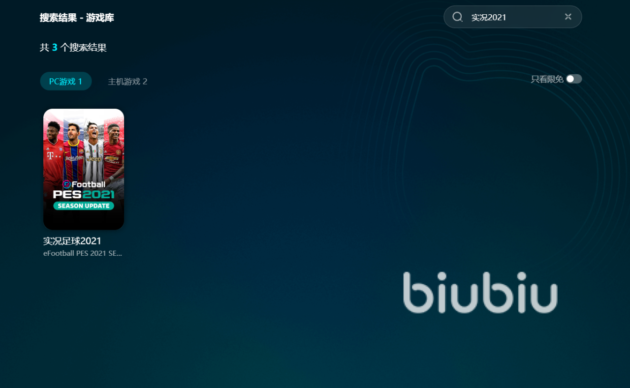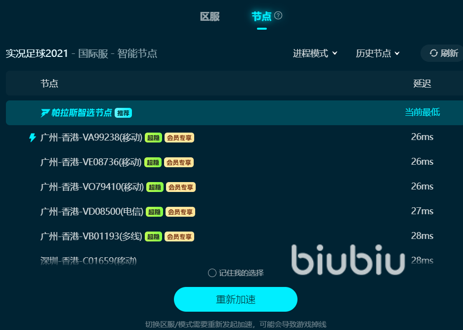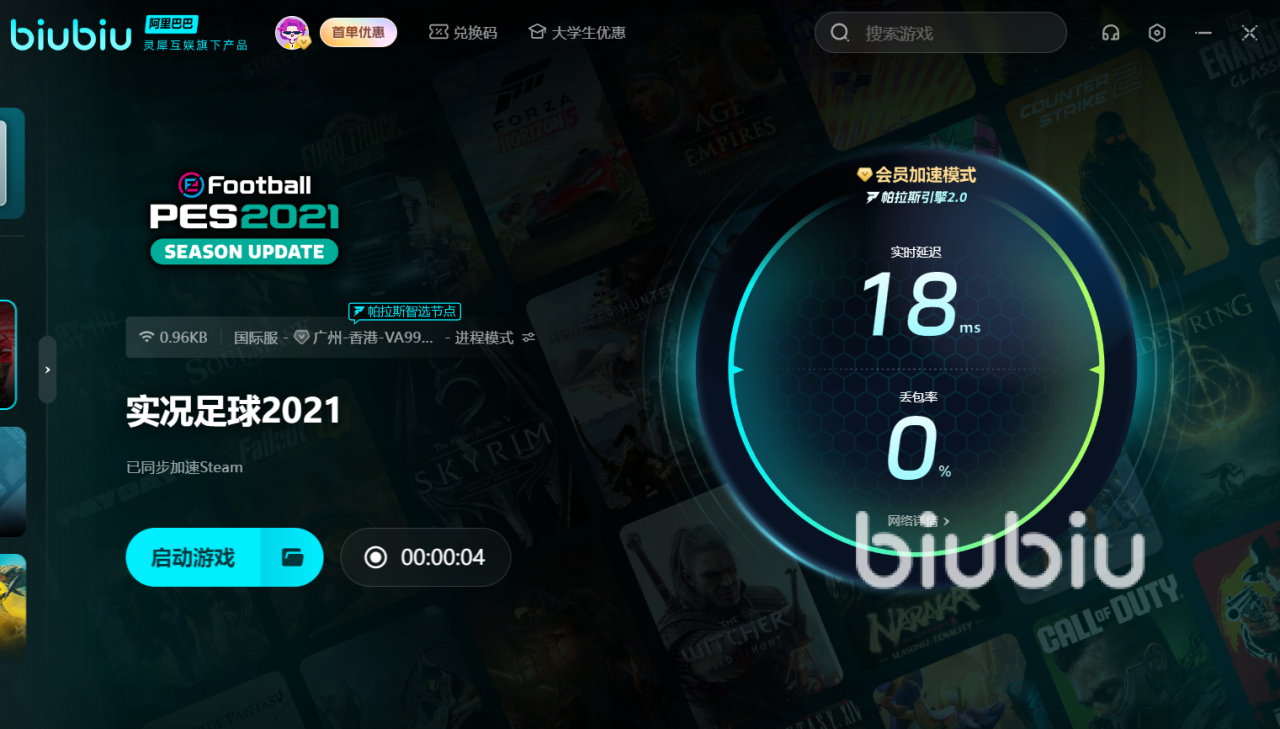 biubiu有丰富的加速节点与覆盖全球的线路,无论你在玩国内游戏还是海外游戏,都能帮助你降低网络延迟,满足各种情况的网络需求。加速的使用方法比较简单,大家安装好软件后,登录平台账号,然后在主页上方搜索栏键入“实况2021”,就能进入专属页一键启动加速。