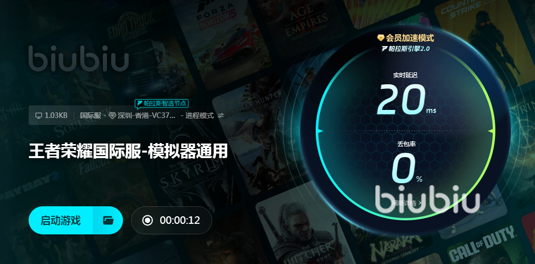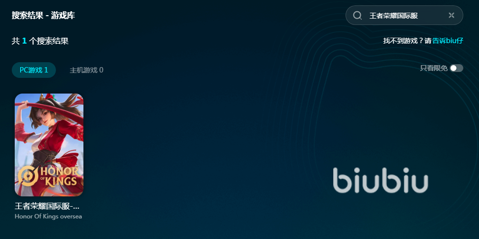 王者荣耀国际服的玩法跟国服类似,并且支持讲语言调成英文或者汉字,玩国际服的前提是网速一定要给力,不然连服务器都登不上。大家可以用biubiu软件加速游戏,直接搜索游戏名就可以看到加速资源。还没安装软件的小伙伴感激点击上方按钮下载它,现在注册biubiu新用户还能享受24小时免费加速。
