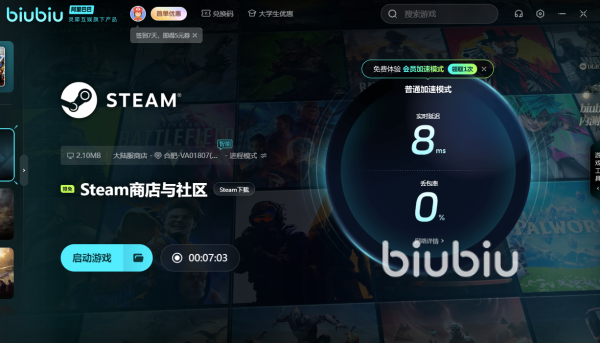 由此可以看出,biubiu加速器能让网络的现状趋于稳定,这样对于我们解决卡顿问题是一个非常大的帮助。另外告诉大家一个好消息,它目前对于steam商店与社区是属于可以免费使用普通加速模式阶段,因此如果没有搜索到专属游戏名的小伙伴们可以通过直接加速steam来优化哦。